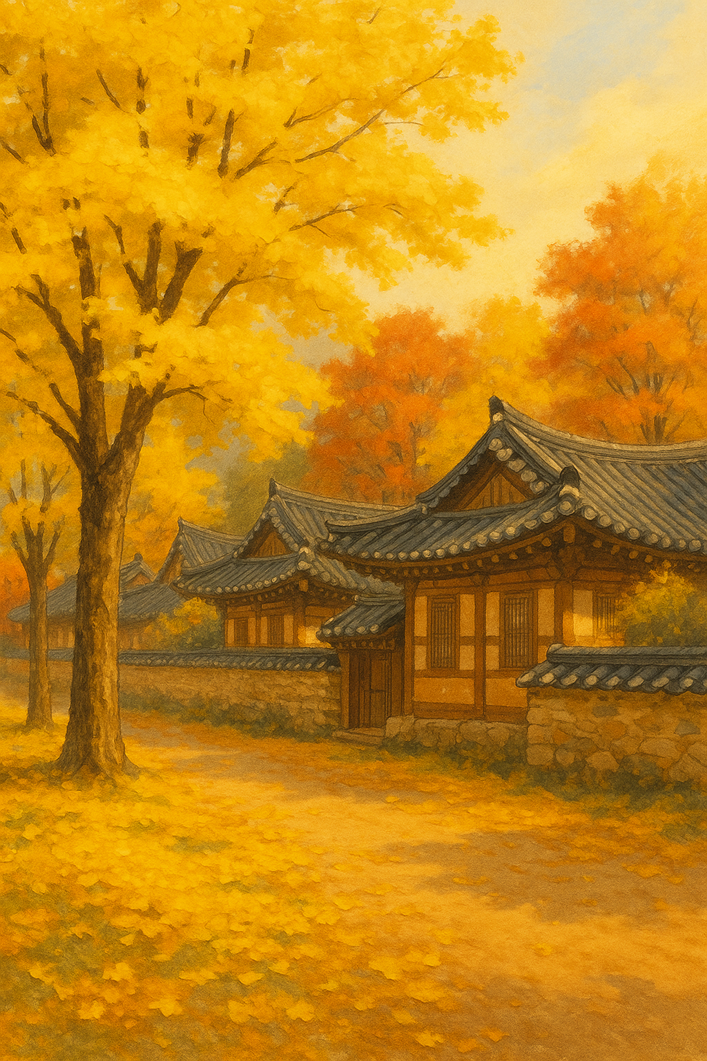 한옥 지붕 위로 노란 은행잎이 떨어지고,