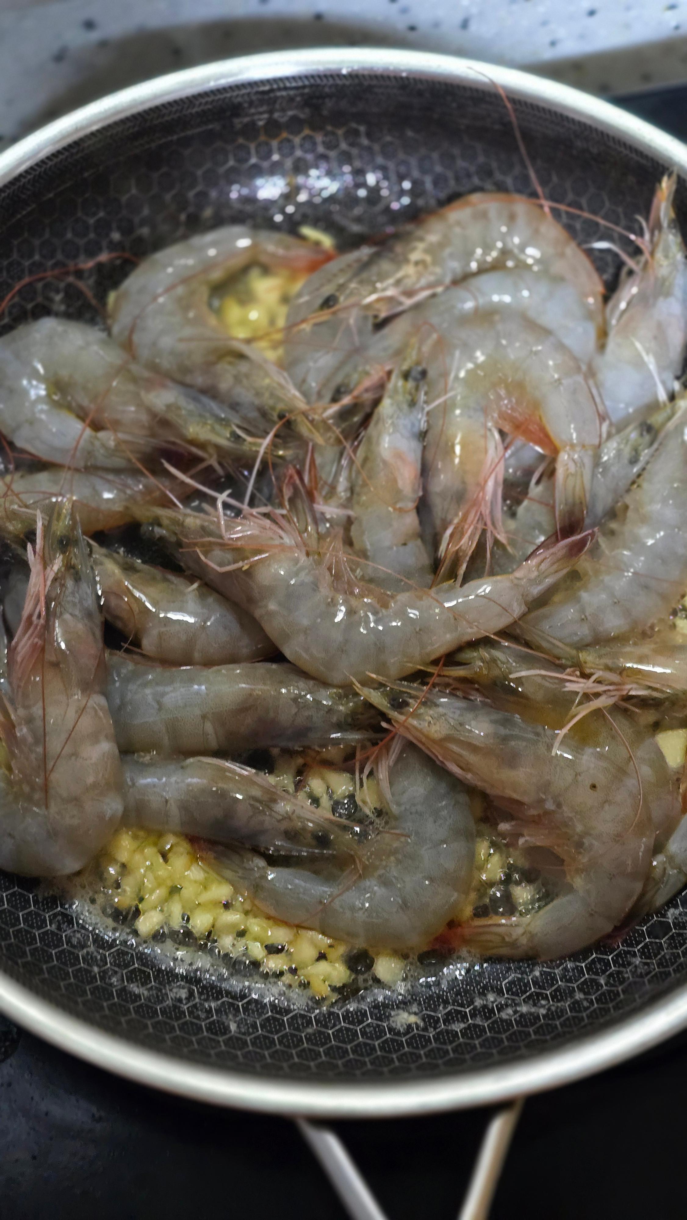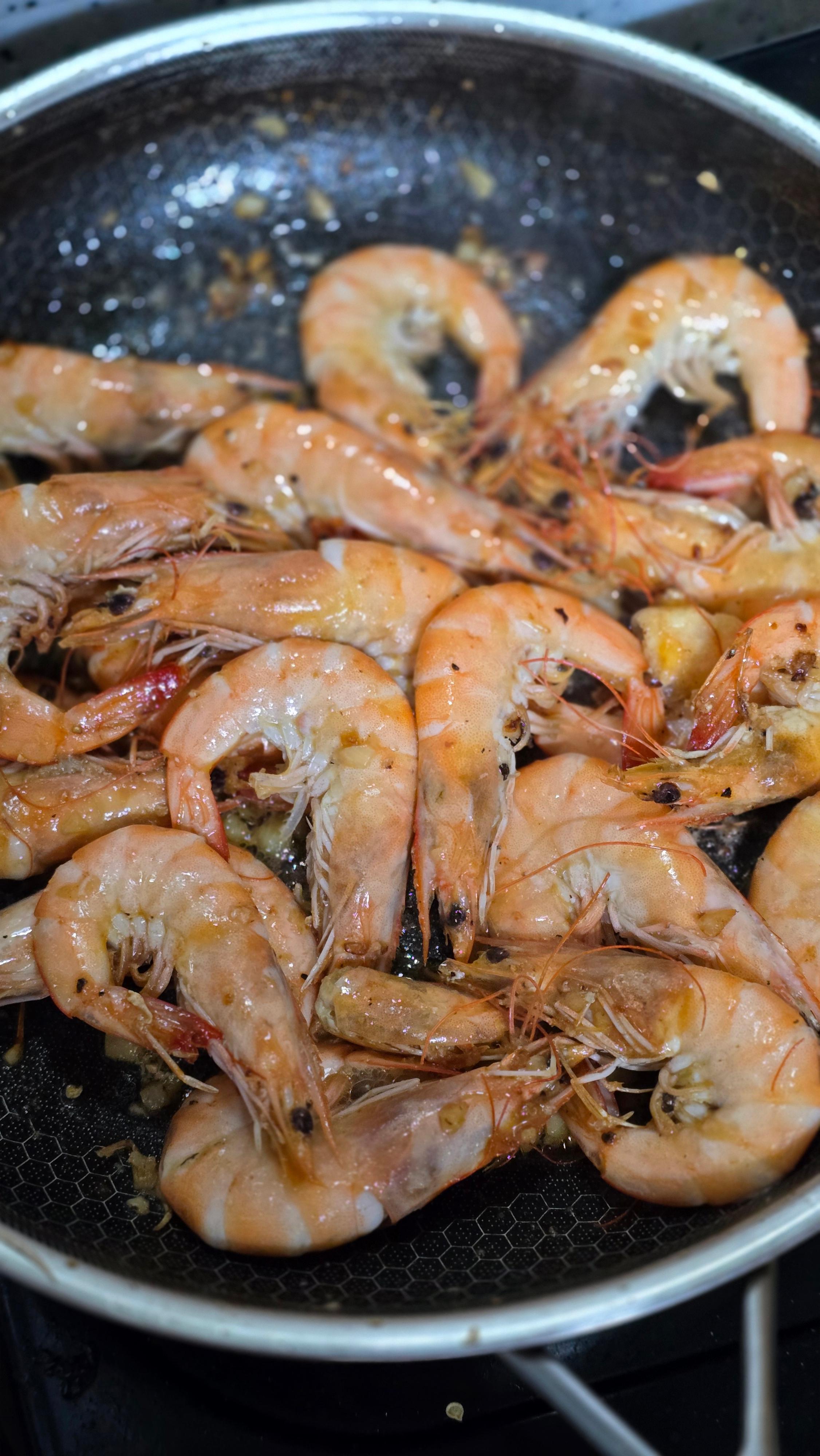 새우를 팬에 올리고 중불로 앞뒤 각각 2~3분씩 구워줍니다.