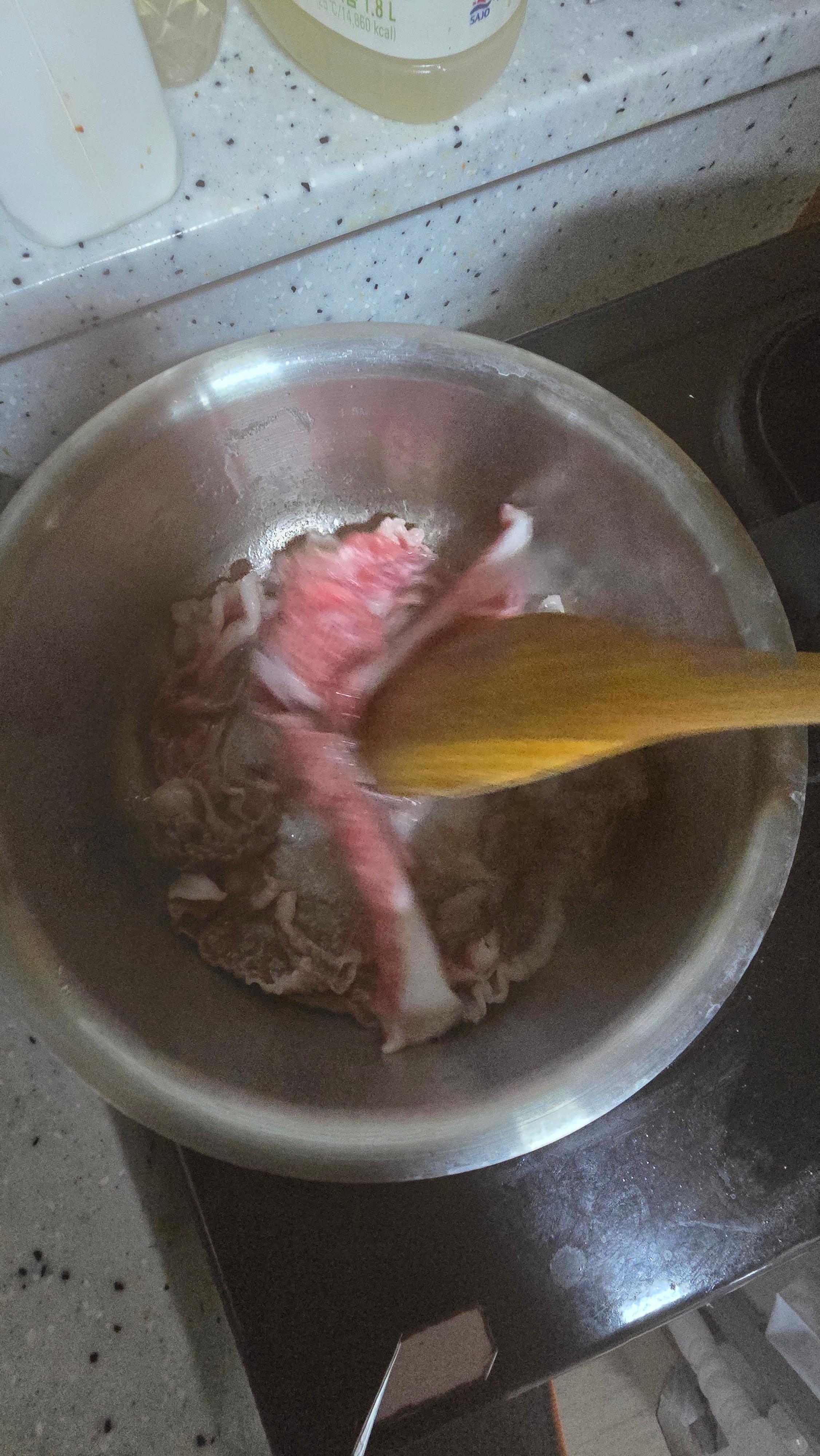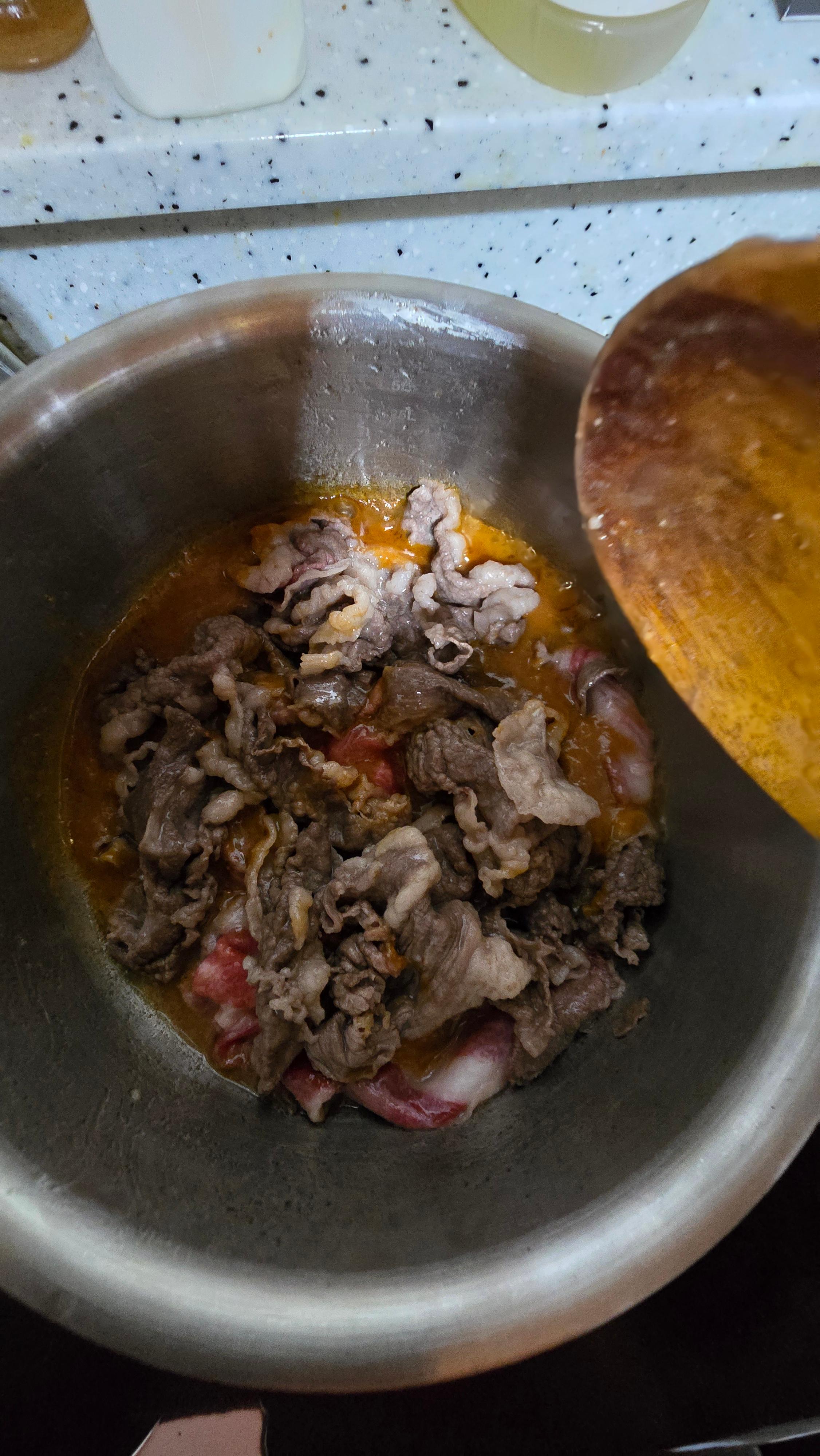 냄비에 차돌박이를 넣고 약불에서 천천히 볶습니다.
