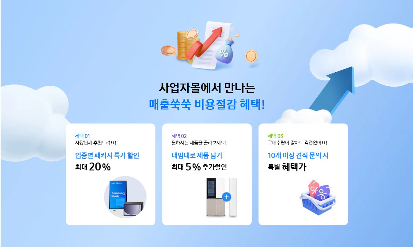 여기에서는 삼성의 다양한 제품군을 할인된 가격에 구매할 수 있을 뿐 아니라, 업종별 맞춤 패키지, 카드 결제 할인, 대량구매 견적, 무이자 할부 등 다양한 비즈니스 혜택을 누릴 수 있습니다.